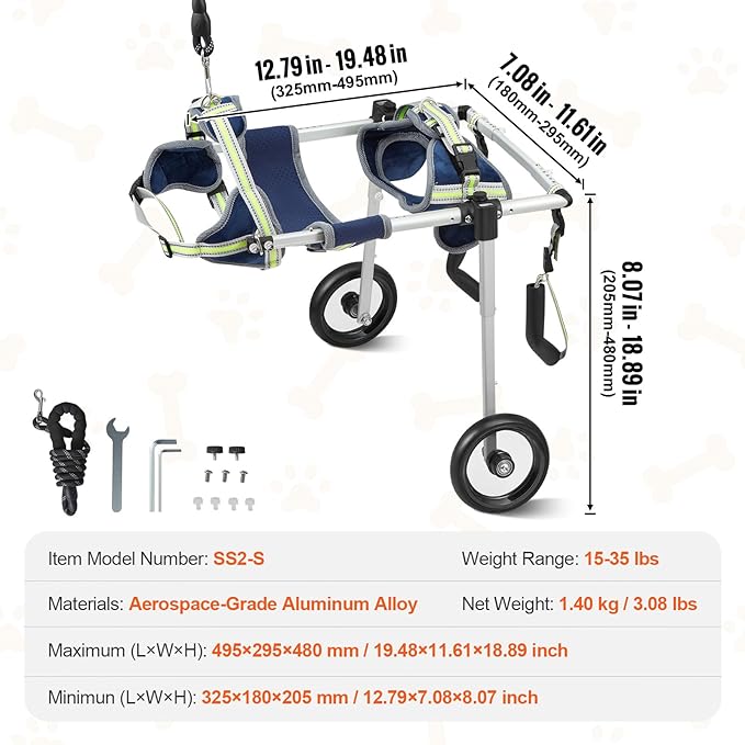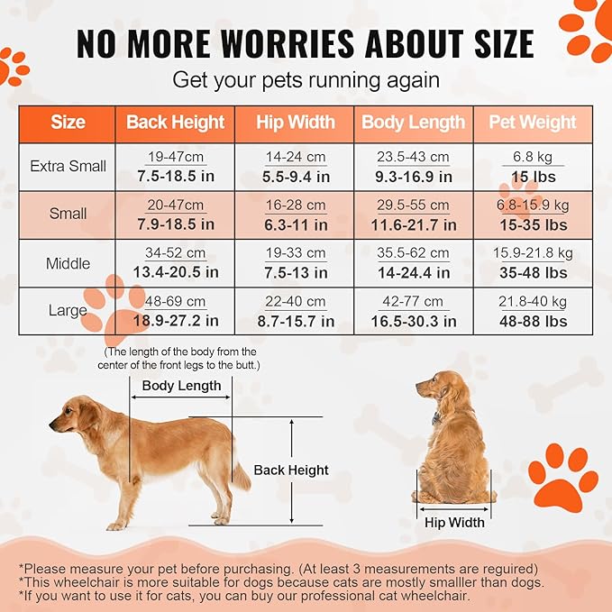 - Adjustable Size: The doggy wheelchair/cart can be adjusted to fit pets of different sizes, including small dogs up to 15-35lbs. The straps snugly fit around the pet's hips for comfort.