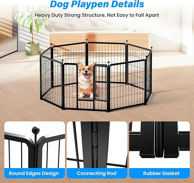 - 【Upgraded Dog Playpen】Playpen dog for medium dogs adopts gravity door lock design, much safer and more convenient. Made of heavy duty metal panels and stakes with black coating, non-toxic, anti-rust. Ensures long time use no matter indoor or outdoor.