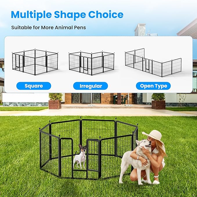 - 【Easy Assemble & DIY Shapes】Each panel is a separate piece. The panels could be assembled in just a few minutes without tools. You could DIY the dog pen to any shape you need, like square, rectangle, round, etc according to your house, garden or lawn.