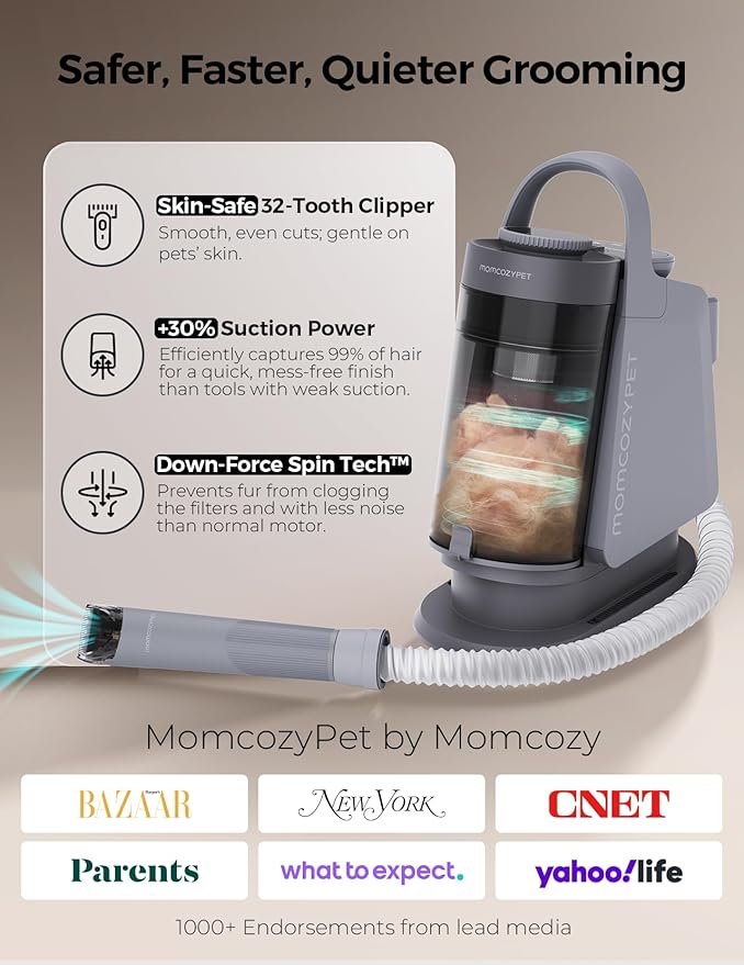 - MomcozyPet pet grooming clippers with vacuum function, can collects 99% of pet hair into a vacuum container. The removed loose hair will be sucked into the vacuum dust box directly when grooming pet hair, no mess, keep your home neat and clean. Even if you are a novice, you can easily complete home grooming.