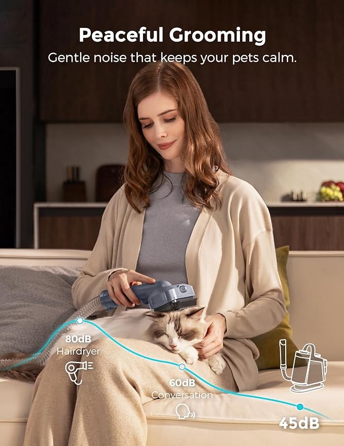 - Quiet & Stress-Free: Keep your pet calm during grooming with noise levels as low as 45dB on the lowest suction setting. For first-timers, try our desensitization steps to keep them calm and relaxed during trimming.