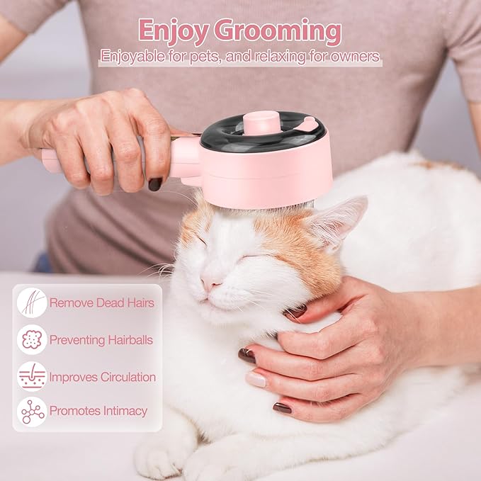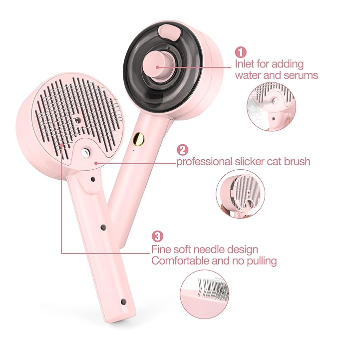 - 【Misting Feature】Our misting feature, which sprays at the same time as grooming, reduces static and flyaway hairs for a comfortable, smooth grooming process. This helps minimize tangling and knotting problems. You can add conditioner or softener to the spray to enhance the softness and shine of your cat's coat. 【Note】Our cat brush only converts water into spray and does not heat it.