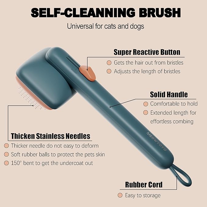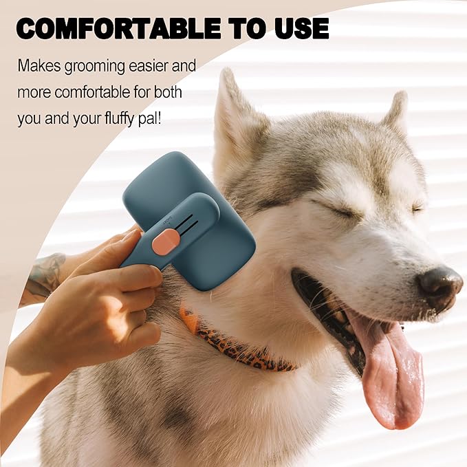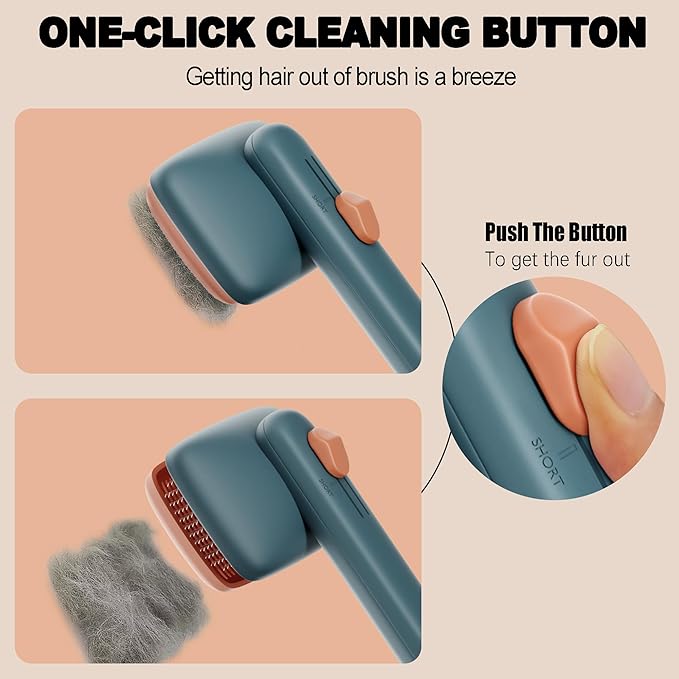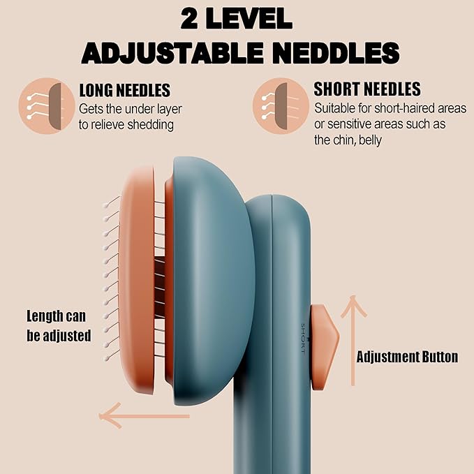 - Upgrade Adjustable Two Level Push Button: The length of our deshedding dog brush stainless pins is adjustable. When you grooming for their sensitive areas like their belly or chin, you can push the button on dog brush to the short level to make the stainless pins shorter, which is better for getting at the harder mats and make a more calming massage effect