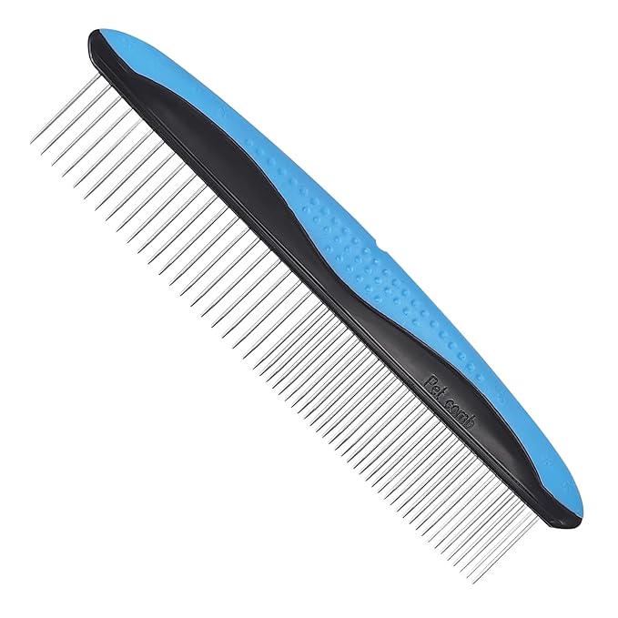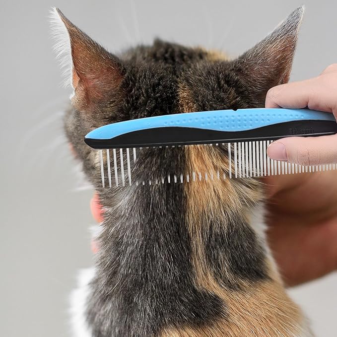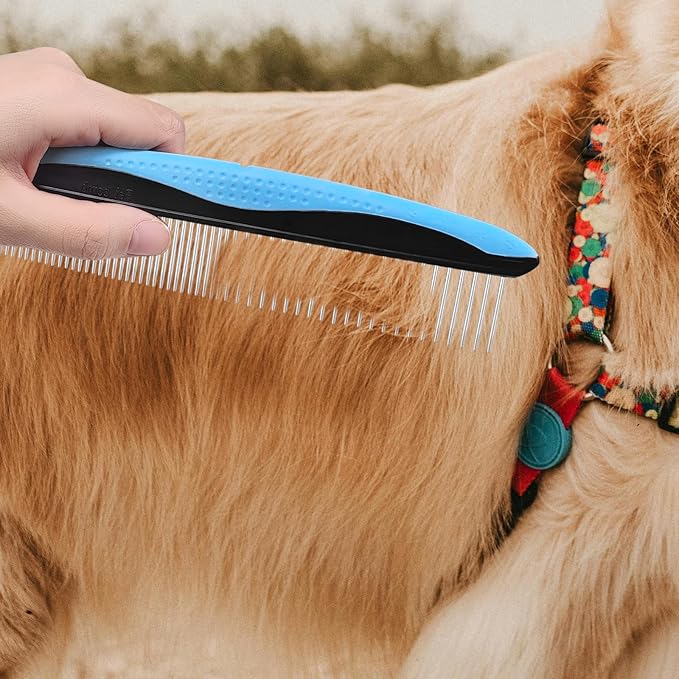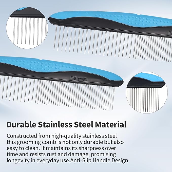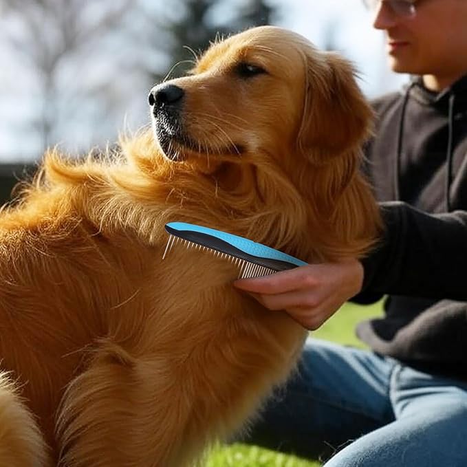 Pet Comb for Dogs and Cats - 2-in-1 Design with Wide & Narrow Teeth, Stainless Steel Round Ends for Safe Detangling, Non-Slip Handle, Removes Knots, Mats, Tangles, and Loose Fur
