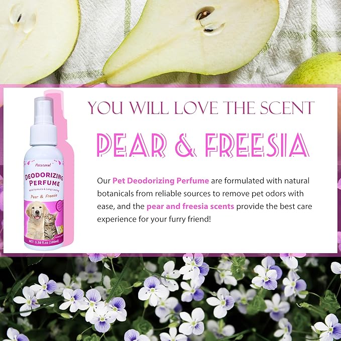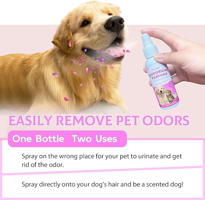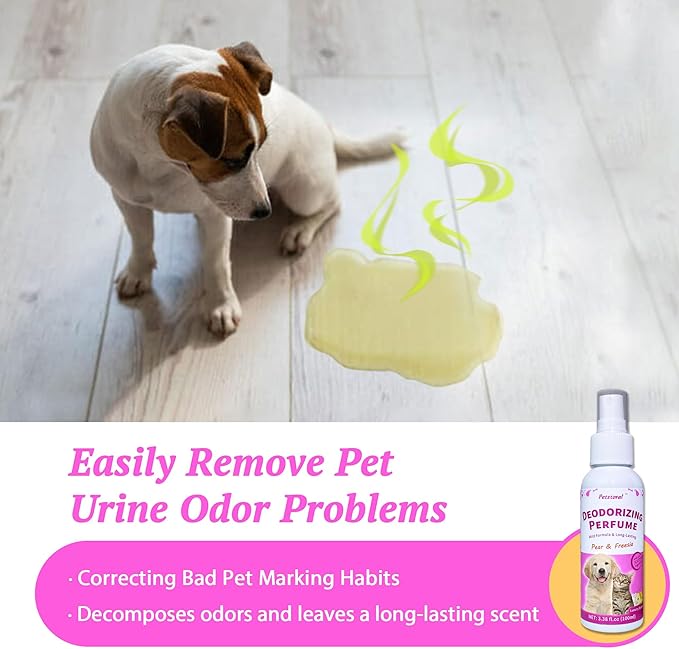- Avoid re-marking your dog - The Deodorizing Perfume Spray combines a mild pear and freesia scent to mask unpleasant pet odors, including urine and body odor. Its natural formula neutralizes odors while leaving a fresh, inviting aroma in your home.