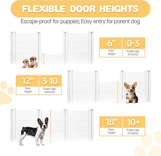 - 【ADJUSTABLE HEIGHT BOARD】The entrance of the puppy whelping box is adjustable, which can be adjusted to 1/3 height, 2/3 height and completely closed to prevent puppies from escaping and facilitate the mother dog to enter and exit.