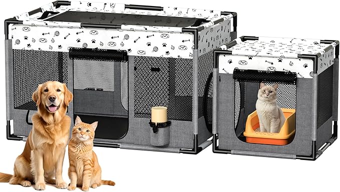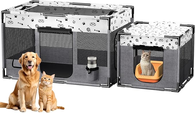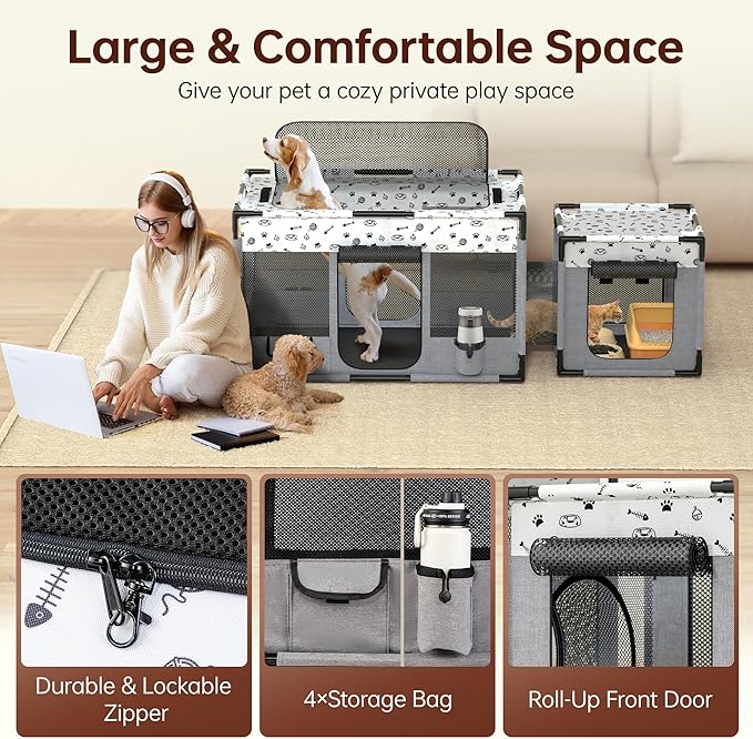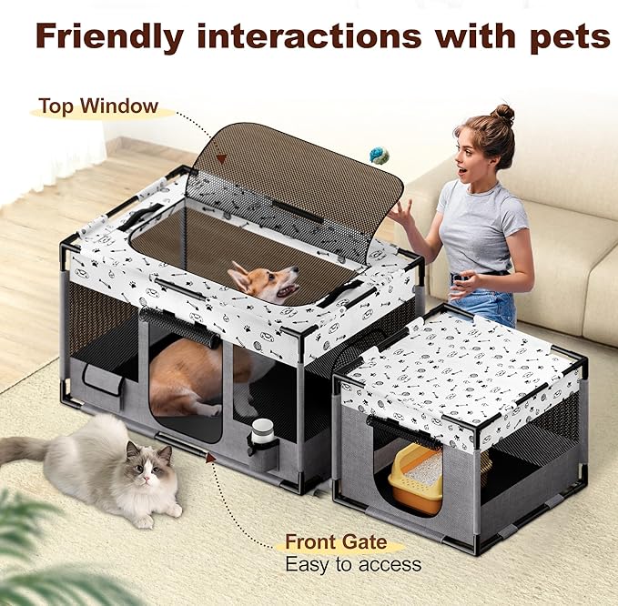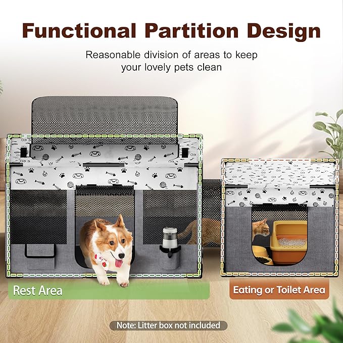 - Functional Partition Design : The pet playpen has two separate functional areas for feeding, resting, playing interacting and using the litter box. Create a clean, cozy and quiet living space for your feline friend! Puppy play pen Recommended For litter box up to 18.5”