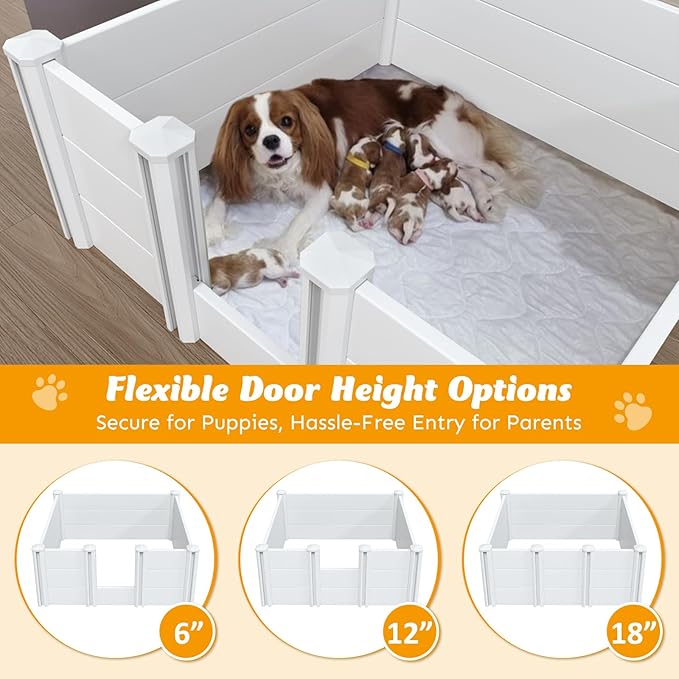 - Flexible Door Options for Convenience and Safety: Customize your preferences with our multipurpose door options for the whelping pen. Choose the doorless design for enhanced security, perfect for recovering or pregnant dogs. Alternatively, opt for the convenient door feature, removing dividers to grant easy access for dogs to enter and exit as they please