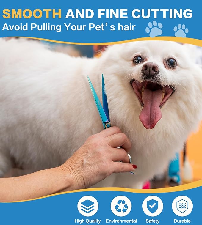 - Features: This pet scissors with ergonomic handles, suitable for most people. Finely polished, frosted surface, fine metal texture. precise adjustable screws effectively prevents screws from loosening due to prolonged use