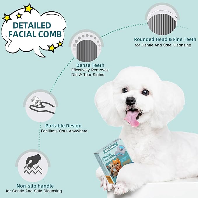 - PREMIUM STAINLESS STEEL :This pet facial combs are made of high-quality, rust-resistant stainless steel, our durable comb won't bend or break. The dense teeth design glides through tangled fur effortlessly while removing dirt, debris, and stubborn tear stains. Perfect for daily pet grooming, it keeps your furry friend clean and comfortable with pain-free brushing.