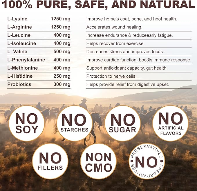 - PURE AMINO ACIDS SUPPLEMENT: Our amino acids for horses is made in the USA, 100% natural, and non-GMO. Its process and materials are all human grade and do not contain fillers, soy, sugar, starches, or artificial flavors - a formula 100% safe for any horse. No any negative side effects and will not test positive for racehorse