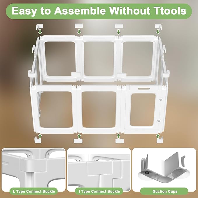 - 【Tool-Free for Assembling Dog Pens Indoor】Interlocking panels of small animal playpen snap together by hand—no screws or tools needed. Includes non-slip silicone feet for hardwood/tile floors and outdoor grass stability. Our clear dog play pen fits for kitty, rabbit, bunny, puppy, ferret, small animals