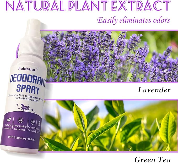 - HELP CHANGE BAD HABITS: The natural extracts in the Dog Deodorant Spray quickly eliminate urine, feces, vomit, and other pet-generated odors that may cause your dog to defecate in the wrong place.The lavender scent prevents your dog from smelling familiar odors and helps with subsequent use of the dog potty training spray.