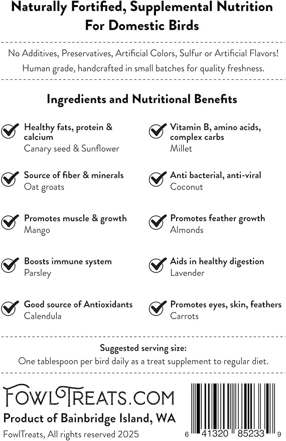 - Comprehensive in Every Bite: Enriched with superfoods like ripe mango, nourishing coconut, and crisp carrots, our treats deliver both exceptional flavor and essential nutrients. This wholesome blend keep your birds stay energetic, healthy, and thriving.