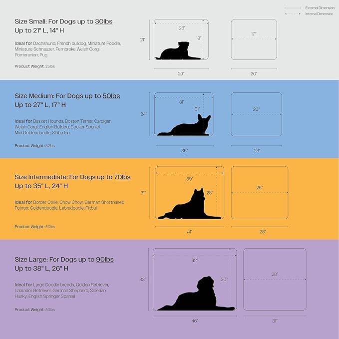 - IS THIS THE RIGHT SIZE FOR MY DOG?: Ideal for dogs up to 17" tall, such as Dachshunds, French Bulldogs, Miniature Poodles, Miniature Schnauzers, Pembroke Welsh Corgis, Pomeranians, and Pugs. Internal dimensions: 25"L x 17"W x 19"H. External dimensions: 28"L x 20"W x 21"H.