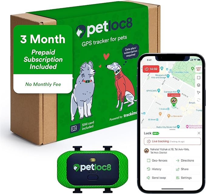GPS Pet Tracker for Dogs by Petloc8 - Dog Tracker Fits on Your Pets Collar, Waterproof, Smart App Controllable Geofencing and Pet Location History - 3 Months Prepaid Subscription Included