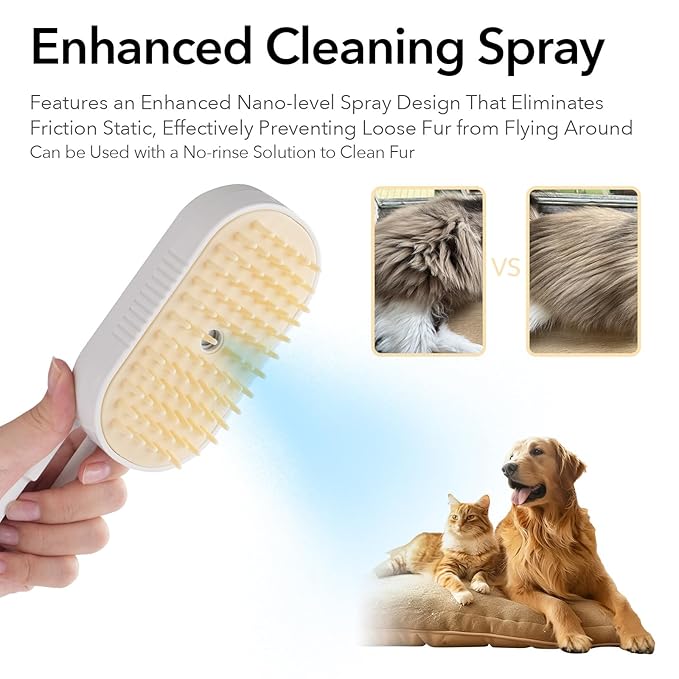 - Advanced Nano-Spray Technology: The steam cat brush features an enlarged nano-level spray design that reduces static friction and prevents loose fur from scattering while using the steamy cat brush. Compatible with no-rinse solutions for easy cleaning