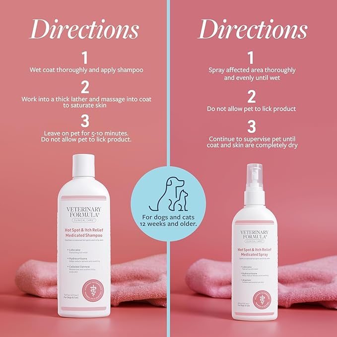 - FOR DOGS & CATS – Safe for pets over 12 weeks old, this anti-itch spray for dogs and moisturizing shampoo provide a non-irritating solution for dog skin allergy relief, leaving coats soft and refreshed.