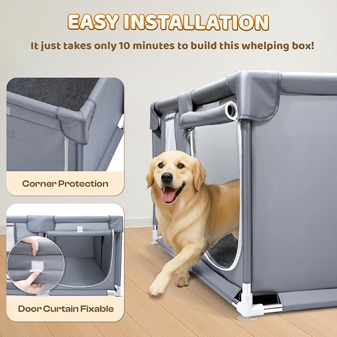 - 【Premium Oxford Sides】Crafted with 150D Oxford fabric instead of fragile mesh, the side panels of this whelping box offer enhanced tear resistance, effectively withstanding scratching and chewing from puppies for your peace of mind.