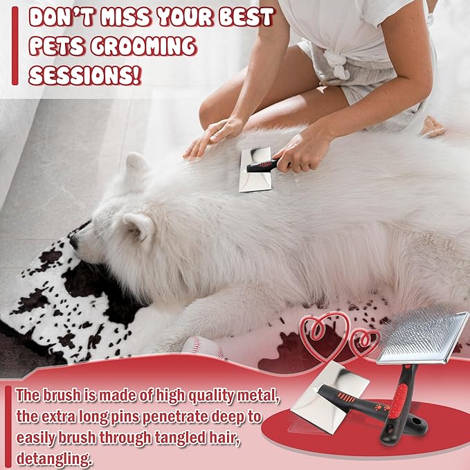 - EXTRA LONG STAINLESS STEEL PINS – THE ULTIMATE SLICKER BRUSH FOR DOGS – Designed with extra-long stainless steel pins, this dog slicker brush penetrates deep into the coat to remove loose fur, dirt, and debris. Ideal for dog brushes for grooming, it works perfectly as a dog brush for long-haired dogs, doodle brush for dogs, and even as a long hair cat brush, keeping your pet’s coat smooth and tangle-free.