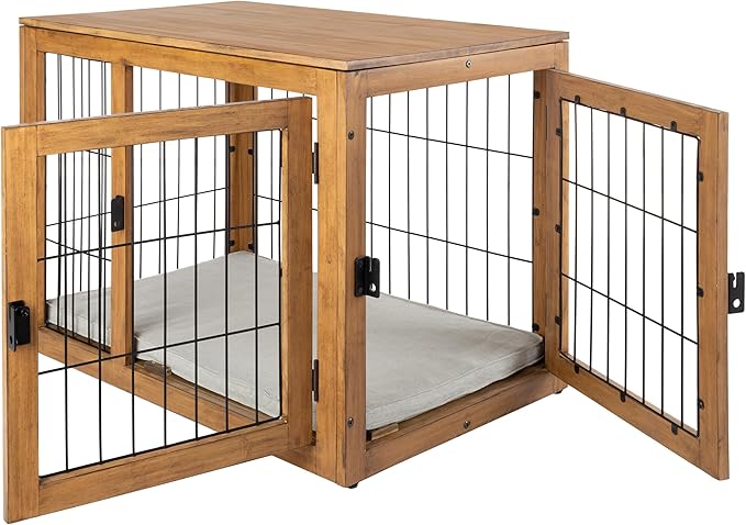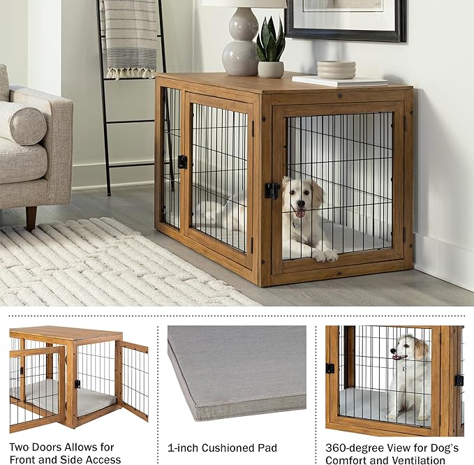 - COMFORTABLE DESIGN - The wood dog crate is equipped with two doors, allowing for front and side access, a 1-inch cushioned pad that is removable for easy cleaning, and a 360-degree open view so your dog can see you and get plenty of ventilation.