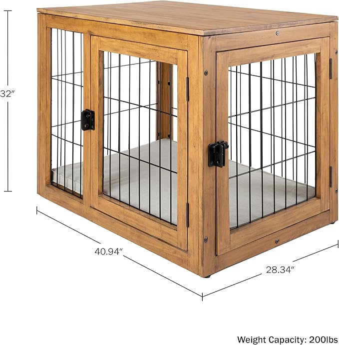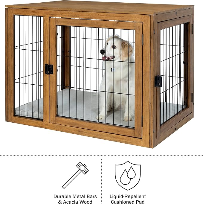 - DURABLE - This pet crate is made of metal enclosure bars and durable acacia wood to ensure this dog crate table looks great for years to come. The liquid-repellent fabric on the included cushioned pad allows for a mess-free cleanup.