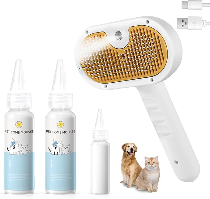 - 1. Multi-Function Pet Grooming Tool This pet steam brush combines de-shedding, steam spray, self-cleaning, and massage functions into one. It effectively removes dead skin and loose hair from your pet’s coat, reducing tangles and matting, and keeps their fur smooth and soft. Suitable for both long-haired and short-haired cats, it meets all your daily grooming needs, helping to reduce the frequency of baths while maintaining your pet’s skin and coat health.