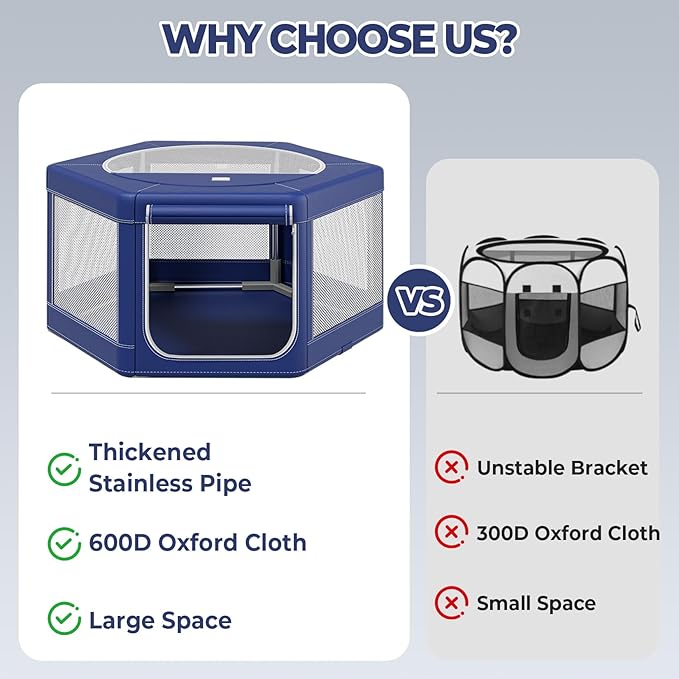- 『Thoughtful Design for Pet's Well-being』- With its soft and smooth texture, the Oxford fabric is gentle on your puppy's skin. The fence also features rounded corners to prevent any accidental injuries. Don't worry, our fence have thicker steel tubing keeps the fence from bending easily. We truly care about your pet's comfort and safety.