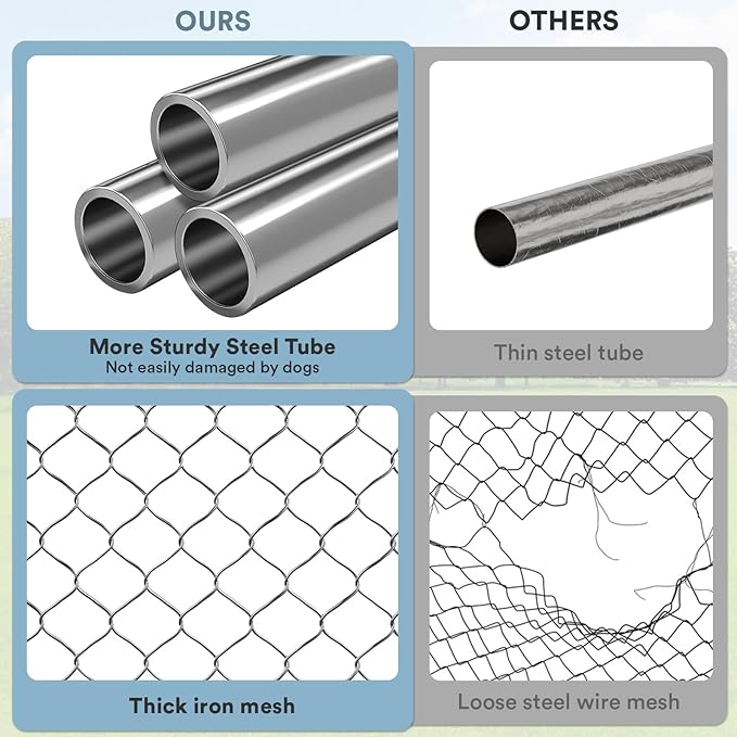 - Easy Installation: Made of durable galvanized steel, this outdoor dog kennels with roof can effectively withstand various harsh weather conditions, ensuring long-term use. The spring buckle connection design allows you to easily complete the installation, saving a lot of time and effort.