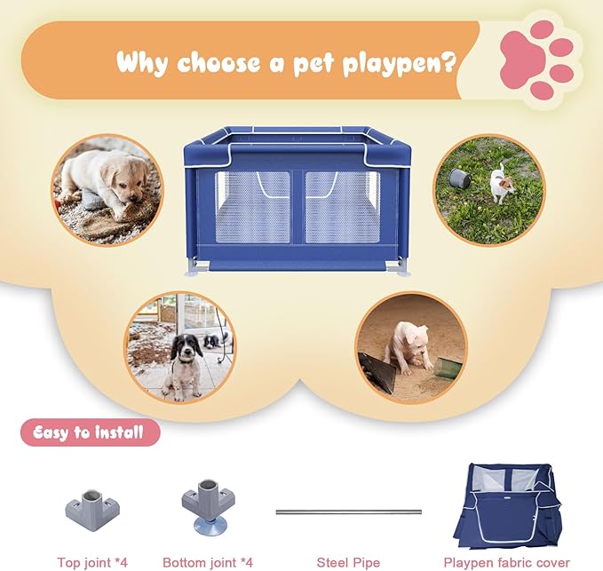 - SAFETY PROTECTION: The dog playpen is made of 0.06mm steel tubing, ABS connectors, and thickened fabric, which is strong and stable, and different from iron, the fabric puppy playpen can maximize the protection of your pets' teeth and claws because active pets always like to tear and chew things around them.Great for small pets!
