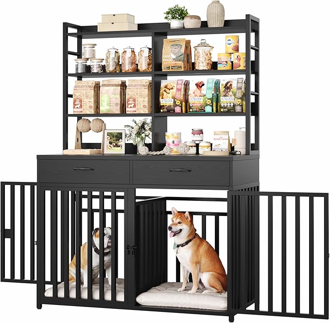 - Large Storage Space: With 2 large drawers on sliding rail, 4-layer premium wood storage shelves, and a large countertop design, it has strong load-bearing capacity, which can store dog toys/food/photos/private items or display collections to show your personality. The dog crate furniture with storage is a perfect organization solution to maximize your space