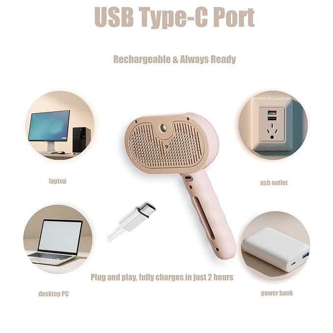 - 【Type-C Interface] 】- Equipped with a Type - C interface; this steam brush allows for easy charging and can be used anytime; whether you're at home or outdoors. It's an essential tool for pet travel. No matter where you are; as long as there's a power source; you can use the steam function to keep your furry friend looking their best.