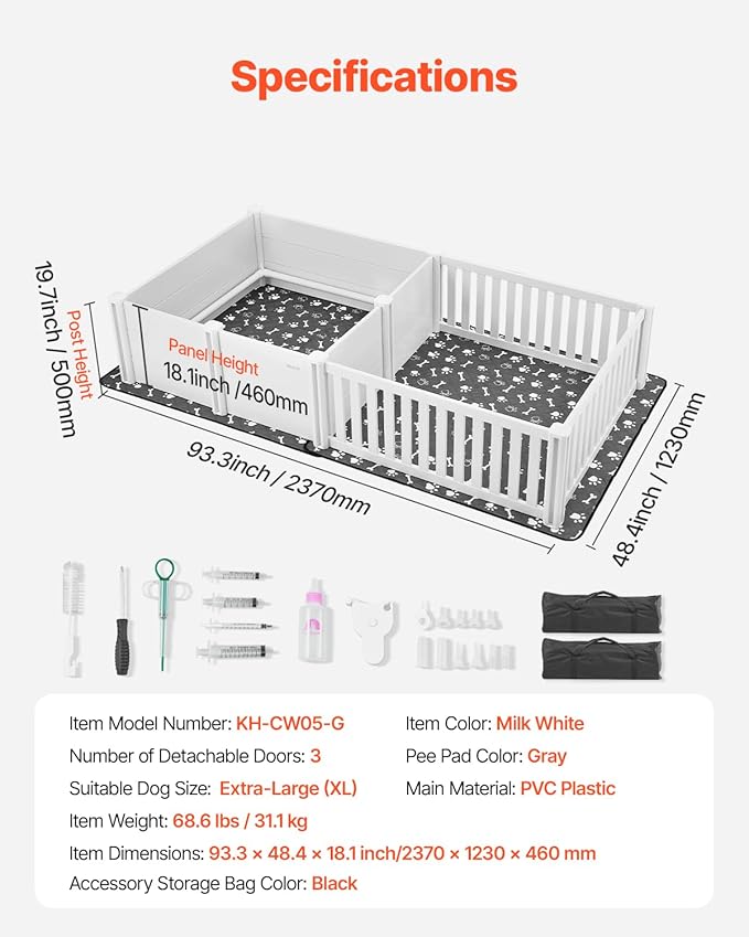 VEVOR Dogs Whelping Box, 93.3x48.4x18.1 inch, Plastic PVC Puppies Playpen with Height Adjustable Door and Washable Pee Pad, 2-Room Layout Indoor Puppy Play Pen for Extra Large Breed Dogs, Milk White