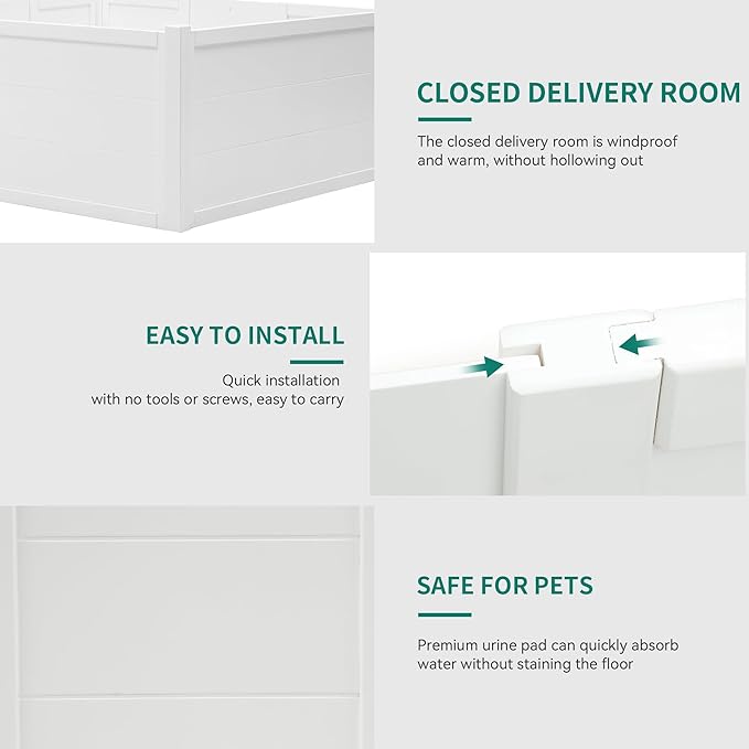 - Tool-less Assembly: Assemble the 39.4''L x 39.4''W x 17.7''H whelping box effortlessly in just 5-10 minutes without any tools; It's also easy to disassemble for compact storage