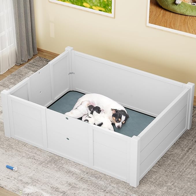 - Durable and Safe Materials: Made from pine and MDF with a sleek, white paint finish, this whelping box ensures a durable, safe, and cozy environment for your dog and her puppies