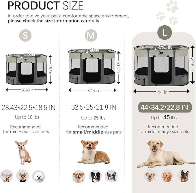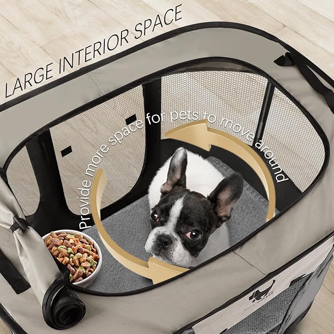 - Breathable & Safe Outdoor Design: The puppy playpen has 360°thick mesh and a removable top to provide good ventilation for pets. The dog cage medium sized dog enclosure has two doors for easy access for your pet. The pop up dog playpen provides ample room for pets to move comfortably while keeping them safely contained.