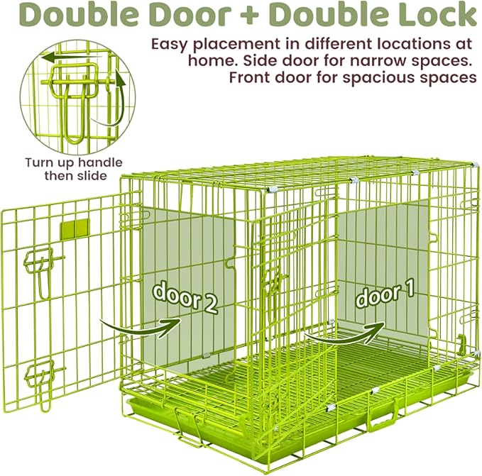 - Double Doors & Dual Locks: Featuring two large doors with low thresholds, on the front and side, for easy access. Convenient for interaction, feeding, and cleaning waste. Each door of puppy crates for small dogs has two escape-proof slide-bolt latches that turn upward and slide to open, preventing your clever pet from escaping