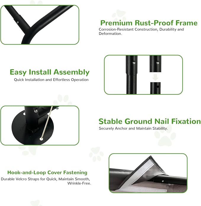- 【Spacious & Multi-Pet Friendly】Measuring 4’x4’x3.3’, this sturdy dog shade shelter comfortably accommodates large breeds multiple small pets. The generous space allows pets to relax freely, while the durable steel frame ensures stability for active animals. Perfect for patios, yards, or farms.