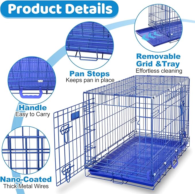 - Floor Grid & Locking Tray: Equipped with a removable floor grid and a leak-proof tray that resists stains, warping, corrosion, and pet odors, the small dog cage makes cleaning a breeze and ensures comfort and tidiness for your furry friends during accidents. Pan stops at the bottom of the foldable dog crate to lock the tray and prevent it from sliding