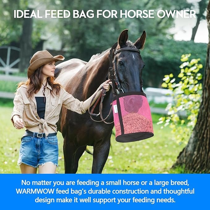 - 【MANY PURPOSES】: WARMWOW horse feed bags are the best way to feed grain to horses that live in groups. This feed bag eliminates waste due to sloppy eating, bullying, and head tossing. During feed time, it stops the fighting over food and helps everyone eat at their own pace. It is friendly for older horses and horse's grain and supplements independent feeding. The horse feeders are designed for everyday feeding, camping and travel feeding that's kinder and better for your horse.