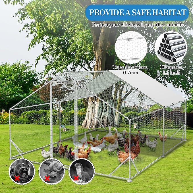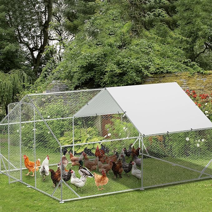 Large Metal Chicken Coop Run,Outdoor Walk-in Cage Peak Hen House with Waterproof and Anti-Uv Cover,Spire Roof Hen House with Security Lock for Outdoor,Backyard and Farm, 9.8 x 13.1 x 6.6 ft