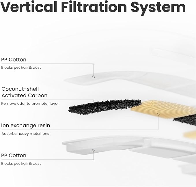 - Advanced Multiple Filtration System: The water fountain for cats features a 3-layer bigger filter that purifies every drop in this cat drinking fountain. Designed specifically as a pet water fountain accessory, it removes hair, heavy metals, and odors, helping prevent urinary diseases and support long-term pet health. (It is best to change the filter every 2-4 weeks)