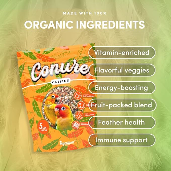 Mycelium Organic Conure Cuisine (5 LB Bag) | Fruit & Veggie Bird Seed w/Added Vitamins | Balanced Daily Nutrition for Immunity & Feather Health | Non-GMO, No Fillers or Additives, Made in USA