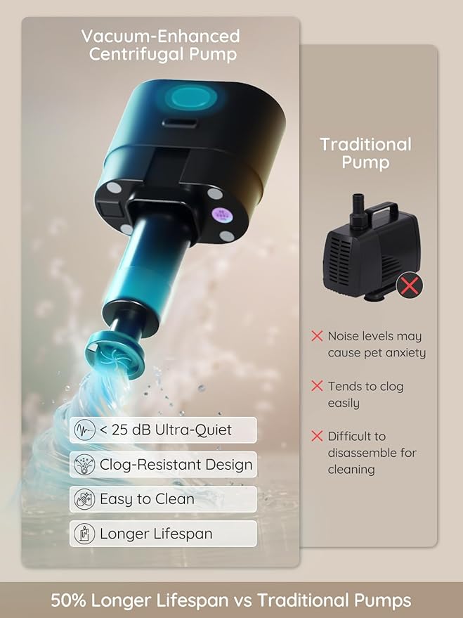 - 【Latest Vacuum-Enhanced Centrifugal Pump Technology】-Say goodbye to traditional submersible pumps, which are hard to clean and easily lead to breakdowns. Our innovative vacuum centrifugal rotor uses a high-speed, waterproof suction system that delivers smooth water flow without clog issues or motor failue. With a brushless motor design, this water dispenser operates ultra-quietly. The 100% leak-proof construction enhances safety and extending the fountain’s lifespan.