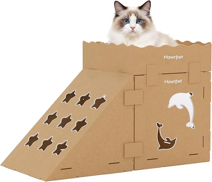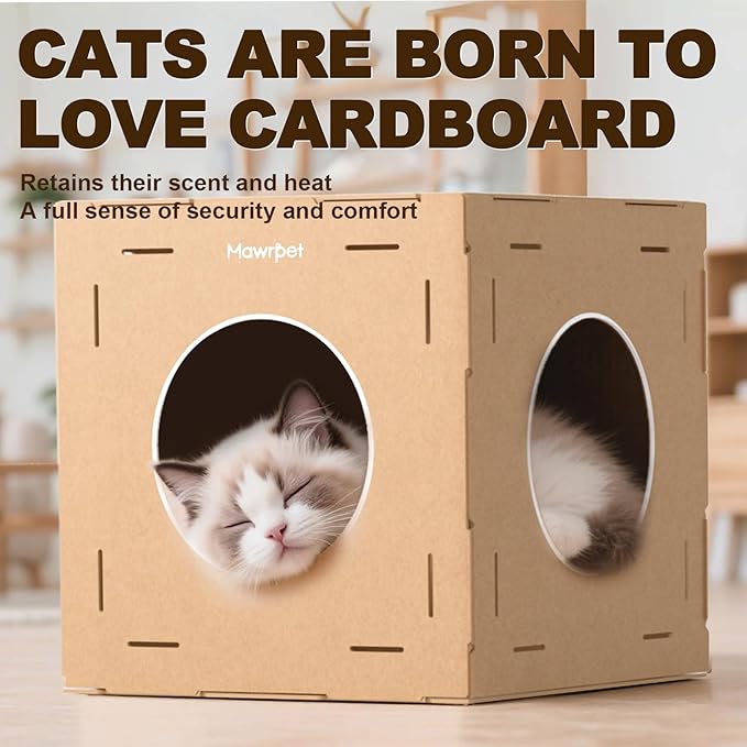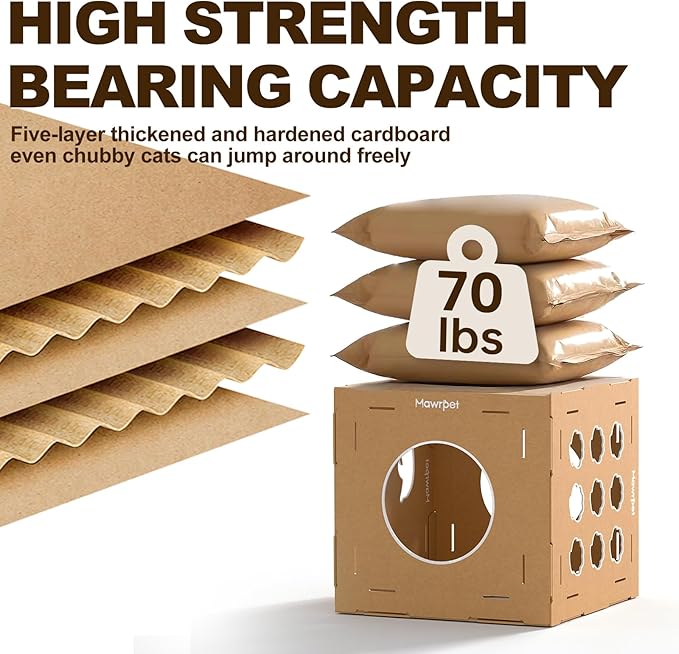 - 【Durable & Premium Materials Cat Scratch Box】The Mawrpet cardboard cat house is built from five-layer corrugated board: a thick, premium kraft liner on the outside for an eco-friendly, smooth finish, and a reinforced EE-flute core that's stronger than standard corrugation. It safely supports cats up to 49 lb.